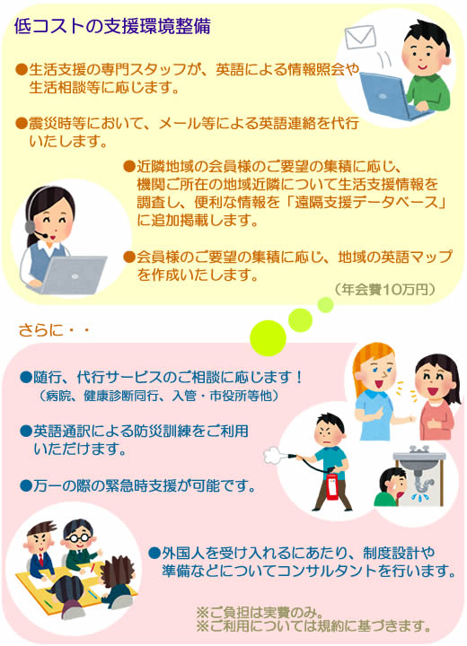 JISTECでは外国人研究者等への長年の生活支援の経験を踏まえ、完全対面型支援スタイルとは別に遠隔型支援スタイルを「生活支援友の会 “One Stop Support Club”」として構築しました。外国人研究者等の受入れにあたり、低コストの環境整備を実現できます。