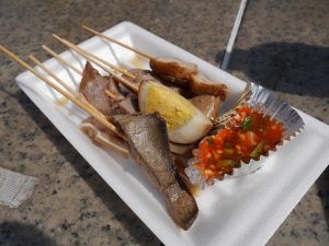 こちらは、豚の耳やレバー、卵の煮込み料理を串で刺したもの。