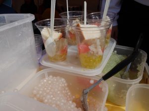 わかりづらいですが、カラフルなゼリーともち米、食パンを入れたカップに
