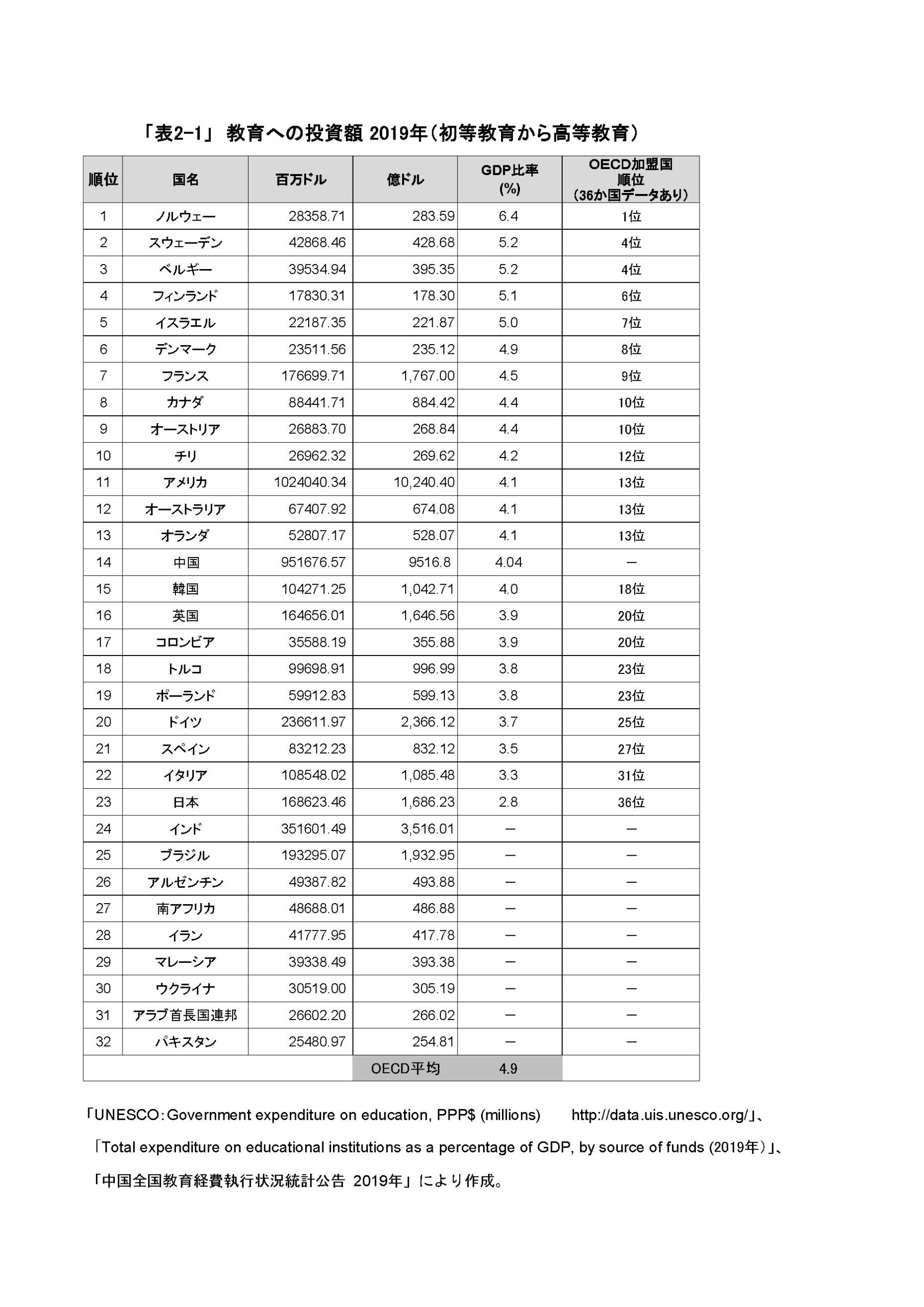 購買力平価(PPP)に基づく表2-2をみると、日本の投資額は32か国中第7位と上位に位置している。しかし、概算として児童・生徒数の章で取り上げられている全人口数で同投資額を割り、人口1人あたりの教育への投資額をみると、日本は約1,333米ドルとなっている。これに対してGDPに対する公財政支出教育費の割合がOECD加盟国中1位のノルウェーでは、約5,252米ドル、6位のフィンランドでは約3,242米ドル、13位のアメリカでは約3,094米ドルとなっている。他方で、PPPに基づく投資額で2位と3位を占める中国とインドにおいて、1人当たりの教育への投資額は中国で約661米ドル、インドで約255米ドルとなっており、投資額全体としてみれば巨額であっても、人口規模からみると、1人当たりの投資額が他国と比べて少額となっている。ただ、いずれにせよ日本の1人当たりの教育への投資額は、OECD加盟国中で最下位レベルであり、科学技術が急速に進展し、イノベーティブな人材が求められている今日において現在の教育への投資額が将来の人的資源の構築に十分であるのか、よく検討する必要があるであろう。