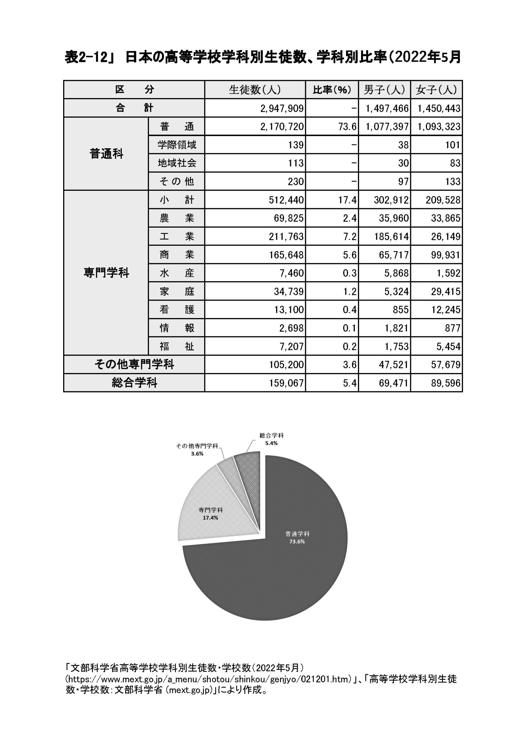 日本の高校の学科は普通科が70%以上を占めている「表2-12」。そのため、高校生に進路意識や目的意識を涵養するうえで、就業体験活動等の地域における学習の充実を図り、「社会に開かれた教育課程」の理念のもとで、学業と現実世界との接続を志向するアプローチには一定の意義がある。あらゆる生徒が、生涯に渡り、進学と就業との双方に耐えうる主体となるように、学校と教育委員会、地域が協働しつつ、教科教育と職業教育、生徒指導を統合的に行う取組は一考に値するのではなかろうか。