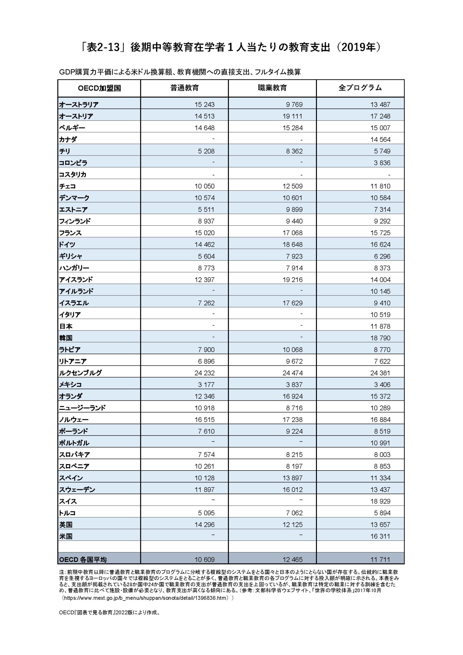 なお、参考までにOECD加盟国の在学者1人当たりの後期中等教育の教育支出について「表2-13」に示す。ヨーロッパ諸国では伝統的にある段階から普通教育と職業教育に分岐する複線型の教育制度となっているため、それぞれの教育支出投入額が示されている。