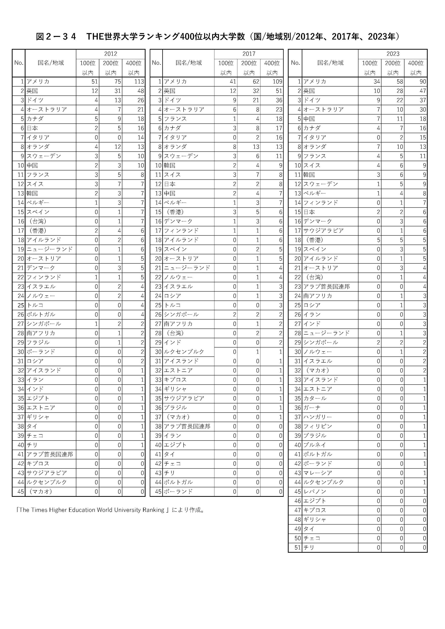 2-34が示す通り、第1位を維持しているアメリカは400位以内に入っている大学の数が2012年の113から2023年の90に減少しているが、その間、400位以内に大学がランクインした国の数が40から45に増えていることから新興国の成長がうかがえる。また、大学総数が40程度のオーストラリアで、2023年に30大学が400位以内に入っているのは興味深い。