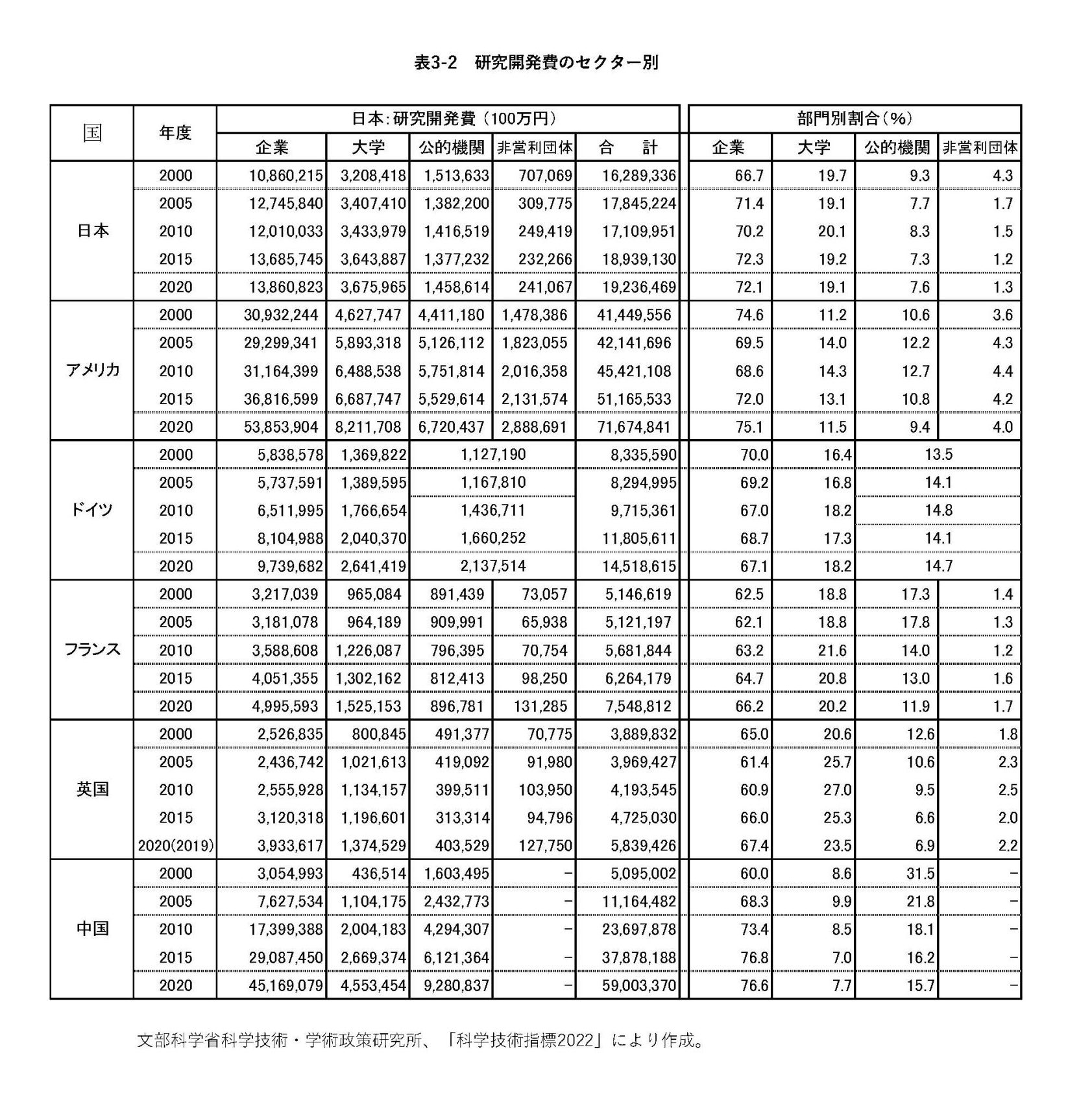 国の研究開発力の比較でよく使用される論文の量については、どの国においても最大の生産セクターは大学であり、その意味で大学の研究開発費が重要である。表から、アメリカの大学の研究開発費が8.2兆円と日本の3.6兆円を大きく上回っており、また20年間の増加率もアメリカ2.2倍に対して日本は1.1倍と大差をつけられている。大学についてはドイツ1.9倍、フランス1.6倍、英国1.7倍、中国10.4倍と日本を大きく上回る増加を示している。日本の論文数が他の主要国に比べて伸び悩んでいる大きな原因が、大学への研究開発投資が停滞していることにあるのは明らかである。
