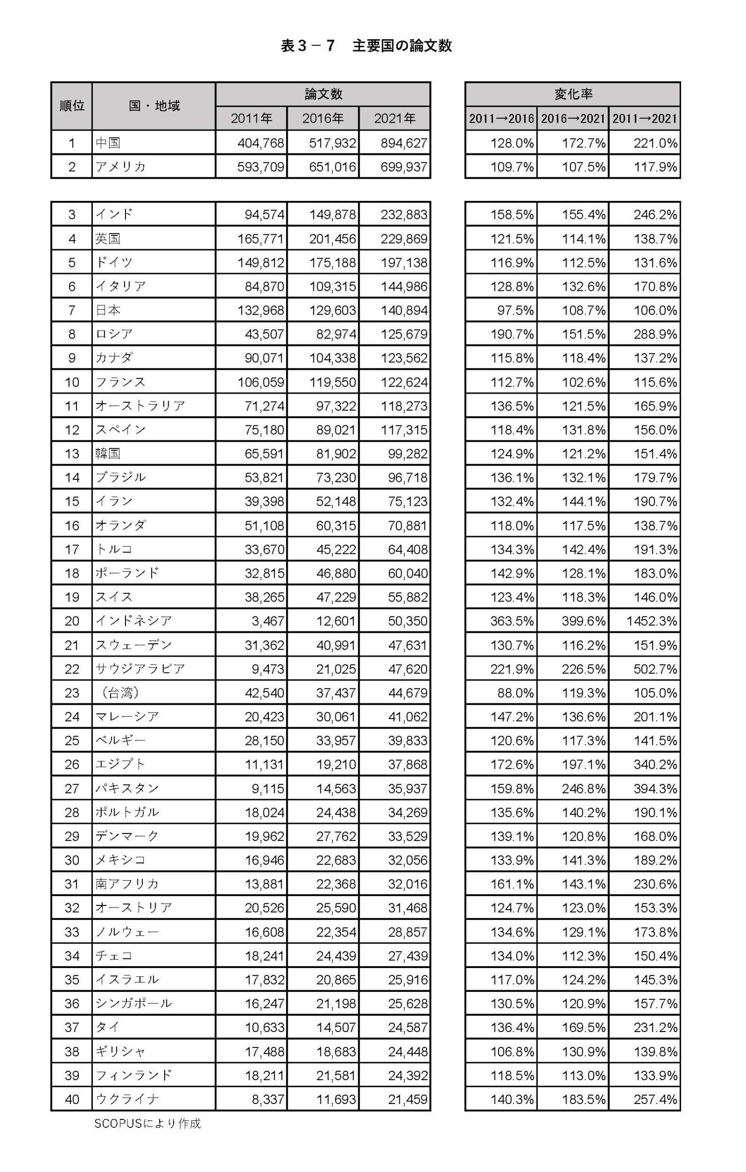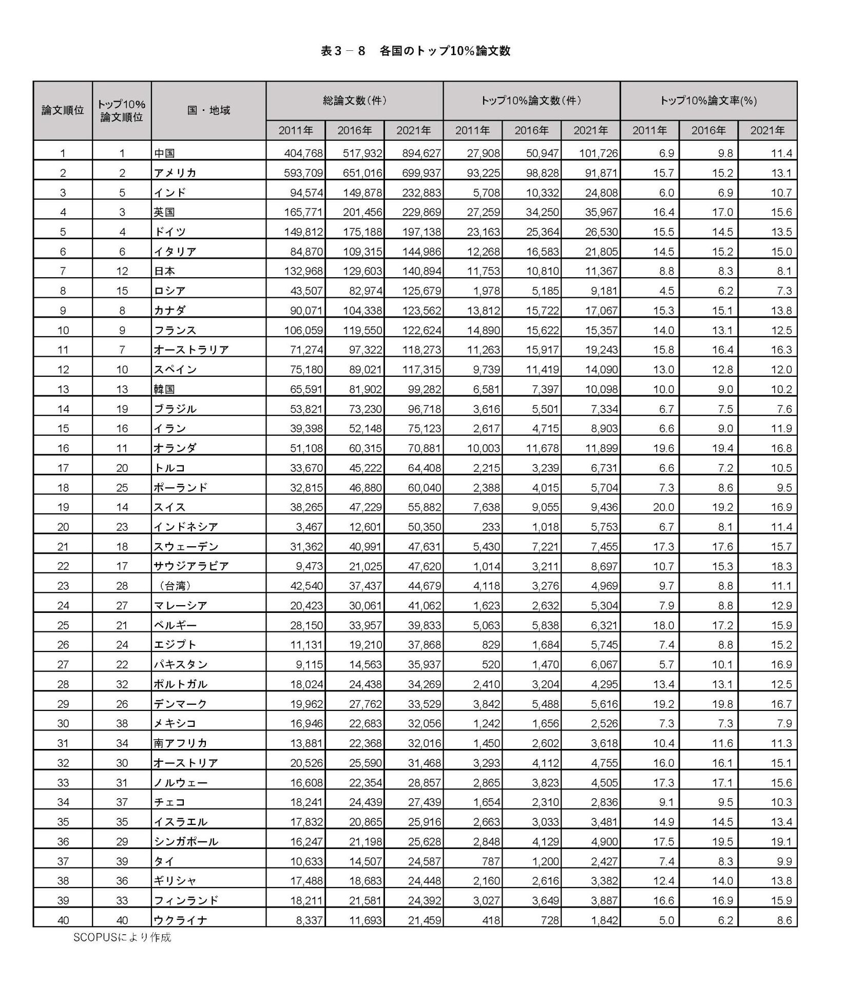 年間論文数数万件の国々の中で注目されるのは、インドネシアが10年で14.5倍に増加し、サウジアラビアも5.0倍の増加を示していることである。特にインドネシアは最近の5年間でも4.0倍に増加している。そのほか、マレーシア2.0倍、エジプト3.4倍、パキスタン3.9倍、南アフリカ2.3倍等ヨーロッパ以外の国で急速な増加を示している例が多い。論文数については北米及び欧州そして日本が世界の中心となっていたが、近年アジアや中近東諸国の比重が急拡大しており、科学研究の中心が次第に移ってきている。