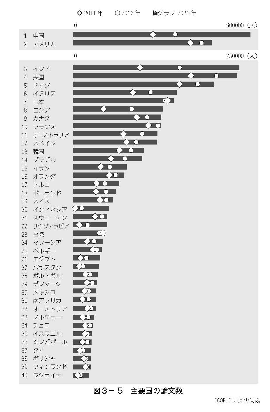 2021年の論文数でトップは中国である。中国の論文数増加は極めて顕著であり、2011年の40万論文から2.2倍に増加し89万論文に至り、アメリカを追い抜いた。中国とアメリカの論文数が極めて大きな比率を示している。