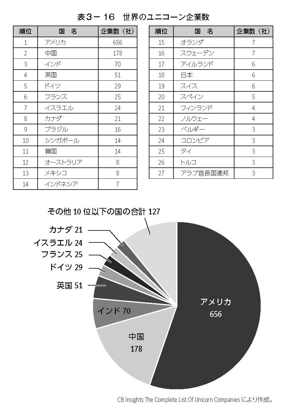 第1位のアメリカは656社と世界全体の54%を占めている。アメリカは2018年81社であったので8倍増である。第2位の中国は178社(2018年95社)で15%を占めており、この2か国で世界のユニコーン企業の約7割を生み出している状況にある。