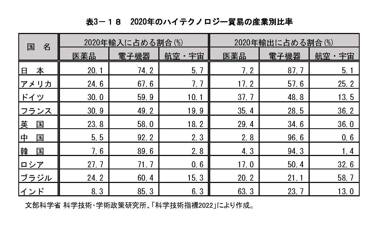 これに対して、アメリカ、ドイツ、フランス、英国では医薬品と航空・宇宙の比率が大きくなっている。アメリカの輸出では医薬品が17%、航空・宇宙が25%を占めている。特にドイツは医薬品が輸出の37%を占めている。またフランス、英国でも医薬品と航空・宇宙の比率が約30%以上となっており、ハイテクノロジー貿易額から見る各国の強みが異なっていることがわかる。