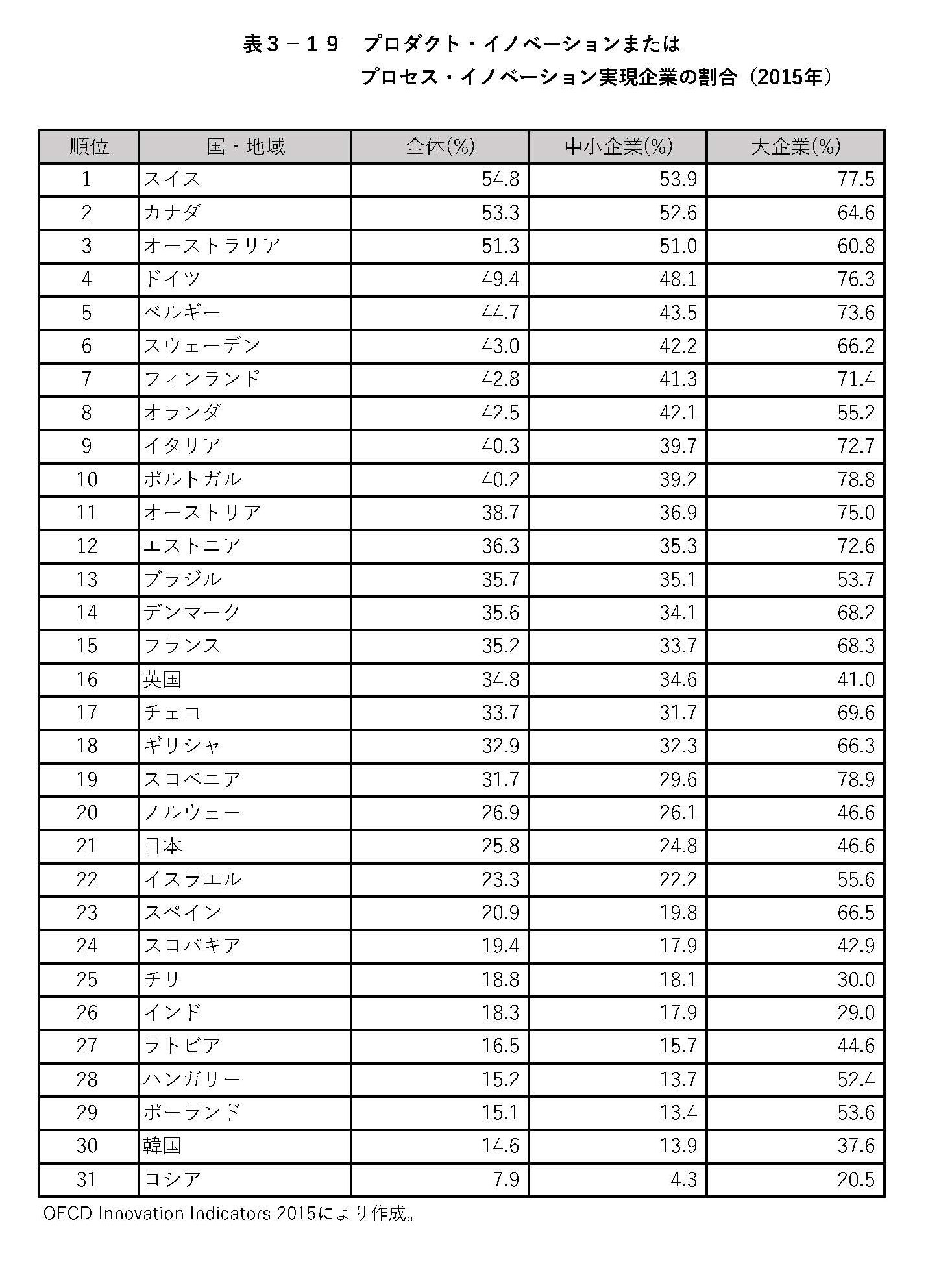 上位のスイス、カナダ、オーストラリアでは全体の実現率が50%を超えている。日本はこの中では21位に位置しており、全体での実現率は26%である。この調査では1企業を1単位として扱い企業数に占める割合を出しているが、企業の規模は多様であるため従事者数によって大企業と中小企業に分類した結果も示されている。どの国においても企業規模が大きいとイノベーション実現企業の割合は高くなっている。上位の国々では大企業での実現率は70%を超えているが、我が国の場合は大企業でも47%にとどまっている。