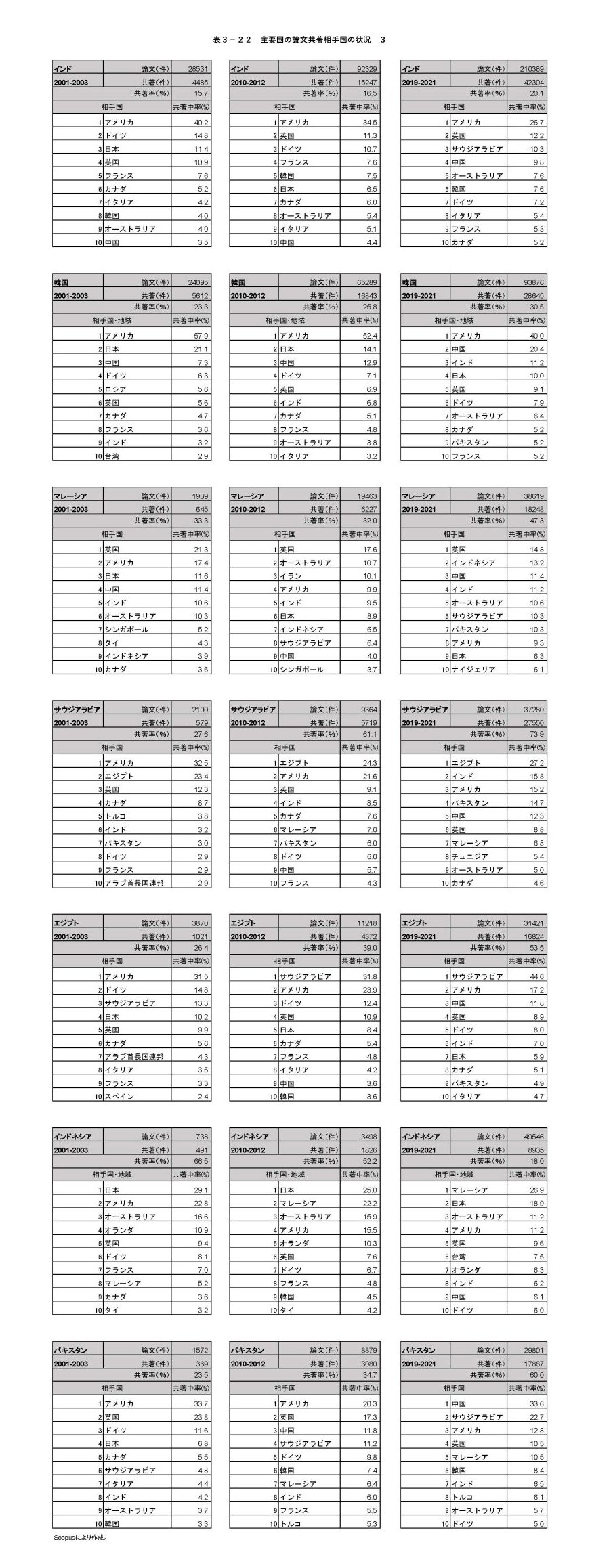 表3-22のサウジアラビアは論文数を急増させていると共に、共著率が70%を超える値となっていることが特徴である。相手国としてもトップがエジプト、第2位がインドであり、第3位がアメリカとなっている。その後も、パキスタン、マレーシア、チュニジアなどヨーロッパ以外の国々が10位以内に入っていることが特徴となっている。