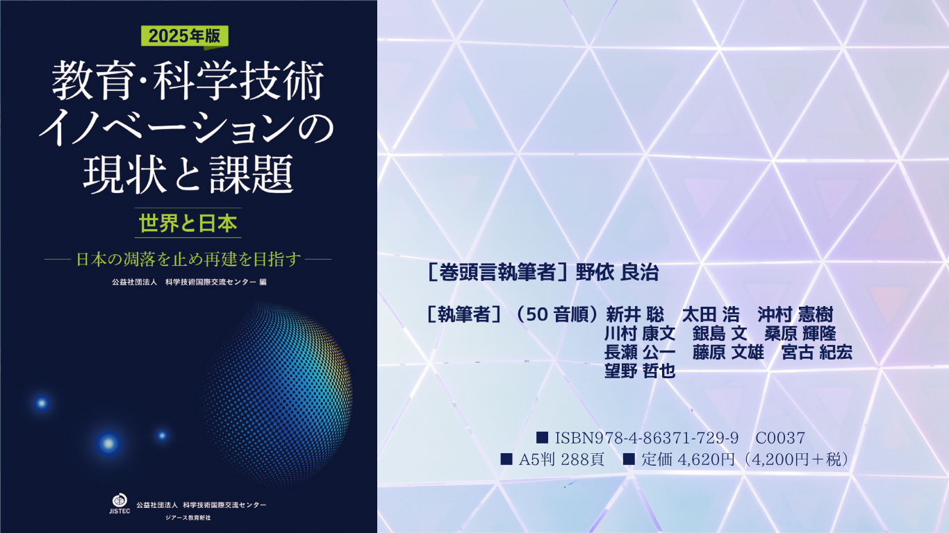 本書の著作権は、科学技術国際交流センターと各著者にありますが、本書の内容を教育や科学技術イノベーションの発展のために自由にお使いいただくことを認めます。ただし、本書の引用においては、出典が「教育・科学技術イノベーションの現状と課題【2025年版】」であることを明記いただくようにお願い致します。