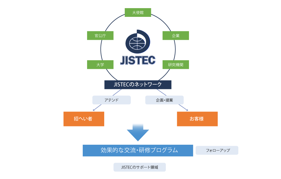 JISTECのネットワークによる企画·提案JISTECは、30年近くにわたり、交流プログラムを⾏ってきた実績により、⼤学·研究機関、⼤使館等に幅広いネットワークを構築·保持しています。